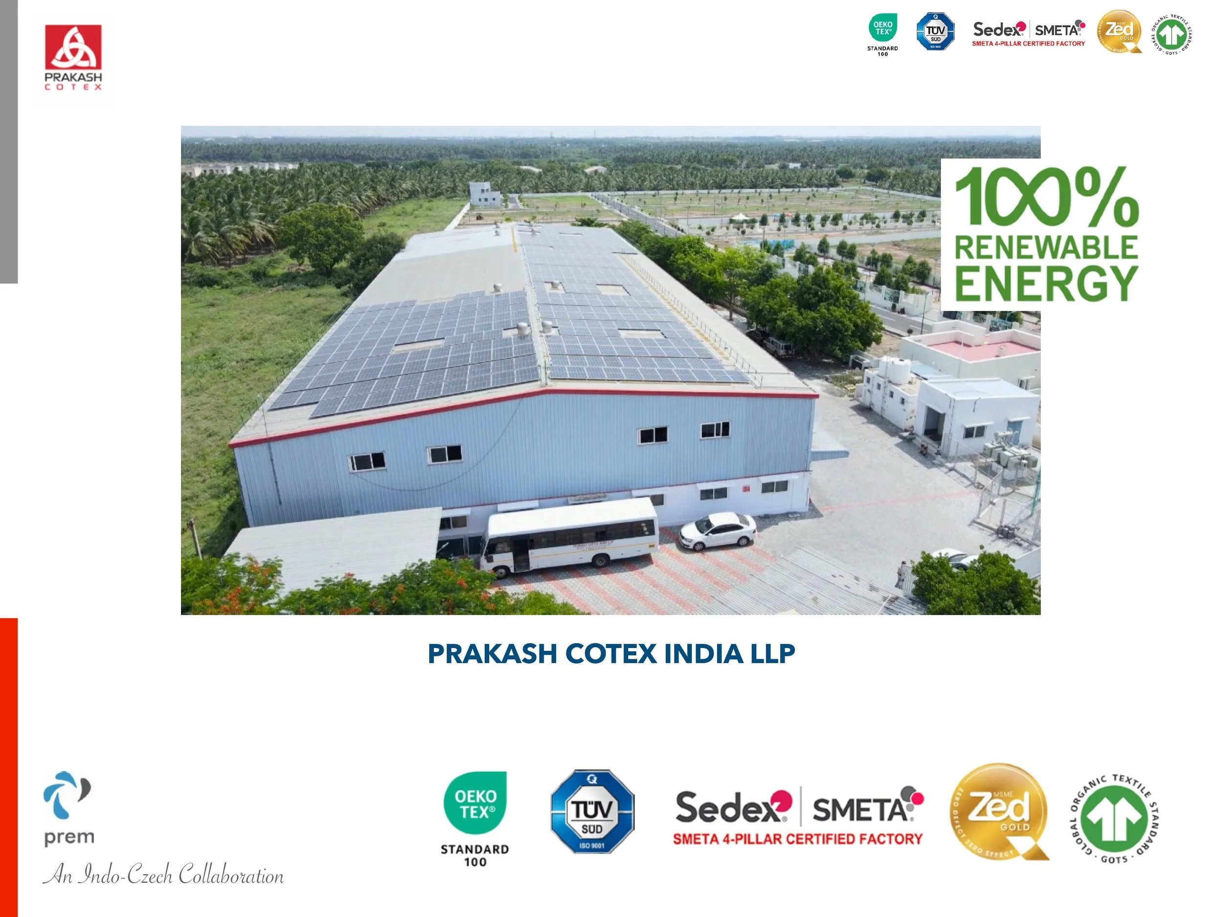 Aerial view of a large industrial building with solar panels on its roof, surrounded by greenery and parking area, highlighting 100% renewable energy.